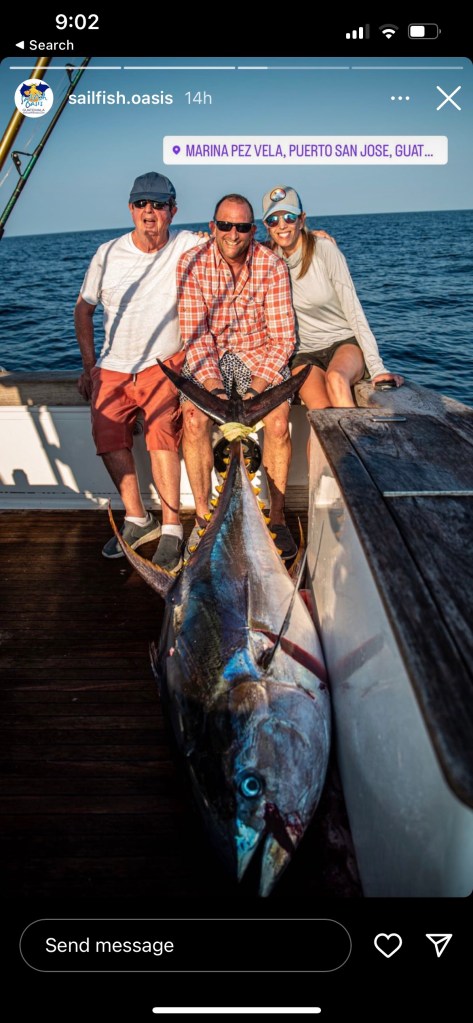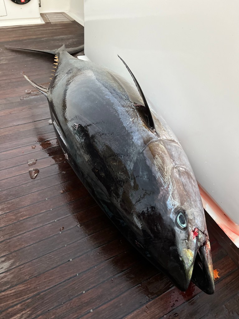 Day 4, yes we went out again, and again we caught tuna, though smaller we still caught one over a hundred pounds, instead of almost 3 hrs, it took me just 15 minutes. Amazing how different fish can be. It probably helped that I had the drag up to eleven and didn’t let the fish build up a head of steam.