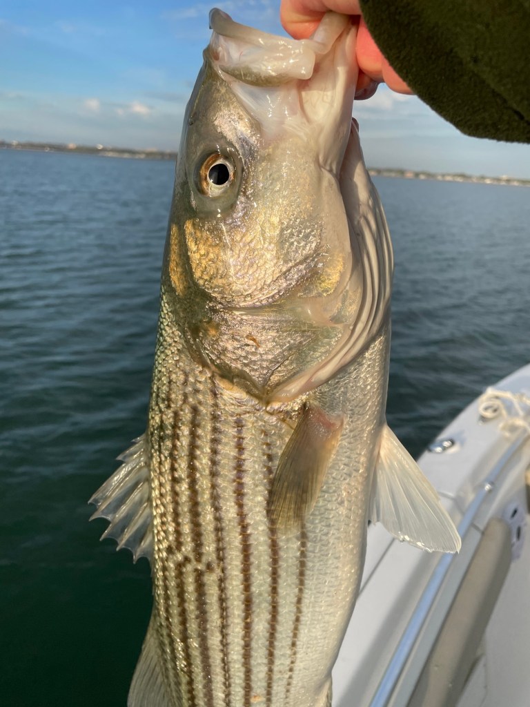 We started out from Quincy Bay marina, didn’t see any pogies. Went to rips at Deer Island light. We fished close to the light on an out going tide.