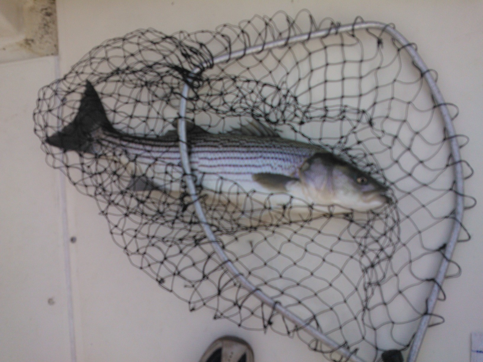 As I approached the boats (near Harding Ledge) at 6:59am, I could see a mass of birds (photo above). Went WOT and got in front of birds and a little upwind. 4th or 5th cast (using my trusty RonZ in bubblegum), I hooked up with a good fish that took a ton of line, only to have him pull hooks. Checked out the lure and it had gotten pretty beaten up between this fish and the earlier one today and others a few weeks back. Switched out the bubblegum for a silver color. Few more cast hooked into a nice fish and ended up with the close to keeper sized fish below (was carefully revived and released very quickly after photo at 7:09am, showing no ill effects).