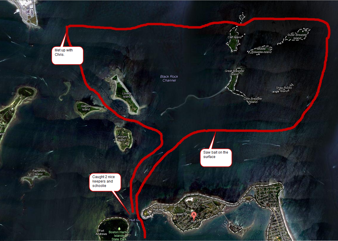 saw some bait on the surface outside Hull gut. Did quick tour of outer islands, met up with Chris and after not seeing much action headed back to where we saw bait. On the way Darren spotted a lot of bird action in the Hull Gut.